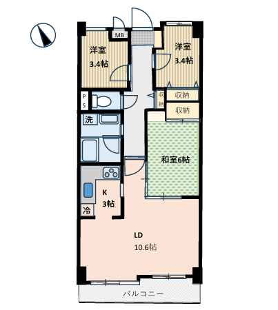 間取内容 LD 10.6畳  K 3畳  和室 6畳  洋室 3.4畳  洋室 3.4畳